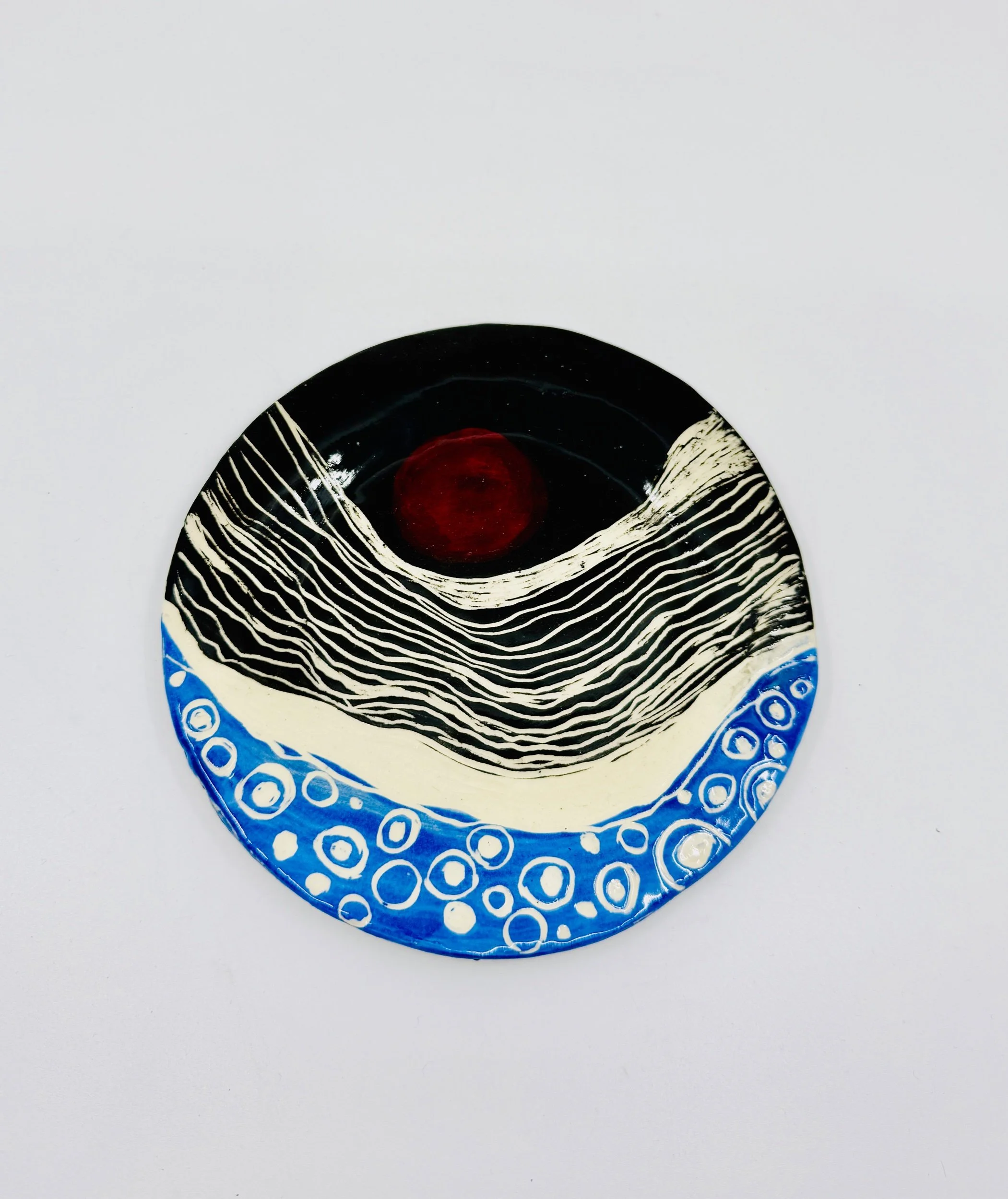 We will create a slab rolled clay plate, and decorate it with underglazes using a technique called sgraffito!-you will create your design, and it will be fired off-site, glaze fired, and returned to the bottle shop within 3 to 4 weeks. Approximate size of plate is 8 inches in diameter.